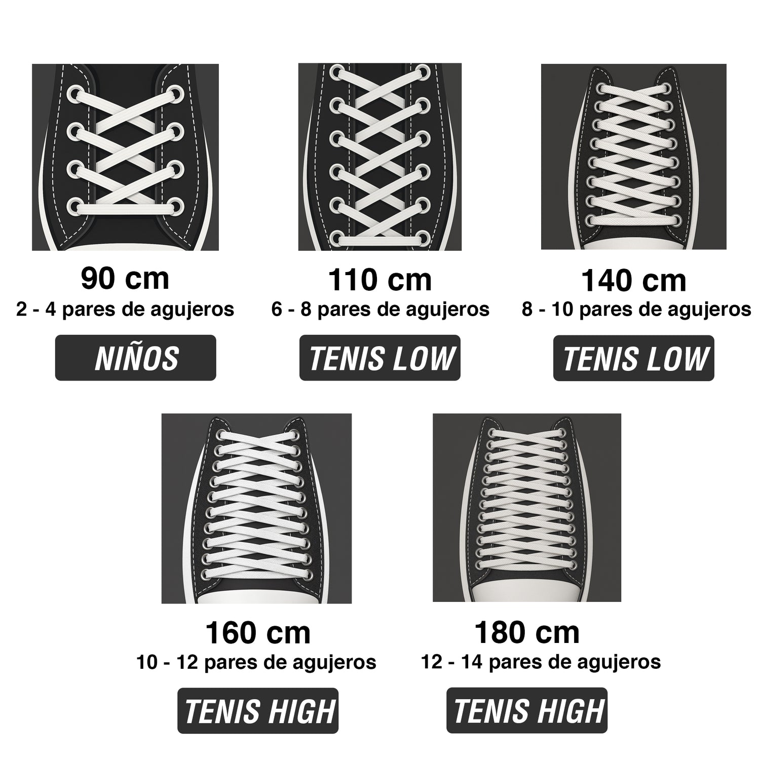 Cada modelo de sneaker necesita una medida de agujetas diferente, pero para saber cual es la indicada, creamos una guía de tallas por numero de par de agujeros e incluso por algunos modelos de sneakers populares. Puedes consultar tu medida aquí.